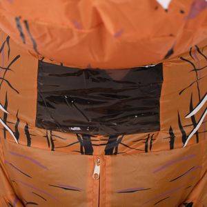 Brązowy kostium dinozaura z dmuchawą, wykonany z poliestru, zapinany na zamek błyskawiczny znajdujący się z przodu. Zestaw zawiera kostium, dmuchawa( zasilany 4 bateriami AA 1,5V), instrukcja obsługi.Kostium pasuje na osobę o wzrości 150-190cm.